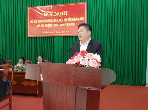 Tại buổi tiếp xúc, 7 ứng cử viên đại biểu HĐND tỉnh thuộc đơn vị bầu cử số 7 và 5 ứng cử viên đại biểu HĐND xã Đoàn Kết nhiệm kỳ 2026 - 2031 đã lần lượt trình bày chương trình hành động, nêu rõ mục tiêu, định hướng nếu được cử tri tín nhiệm bầu làm đại biểu HĐND tỉnh, đại biểu HĐND xã nhiệm kỳ 2026 - 2031. Nội dung tập trung vào thực thi chính sách phát triển kinh tế - xã hội vùng đồng bào dân tộc thiểu số; củng cố quốc phòng - an ninh; phát triển đường giao thông; chính sách y tế, giáo dục, an sinh xã hội; áp dụng khoa học, kỹ thuật, chuyển đổi số để nâng cao đời sống nhân dân vùng khó; đại diện bảo vệ quyền lợi ích hợp pháp, chính đáng của nhân dân, đóng góp cho sự phát triển của địa phương.