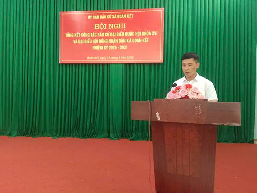Tại hội nghị, đồng chí đồng chí Lý Văn Thành, Ủy viên Ban Thường vụ Đảng ủy, Phó Chủ tịch UBND xã, Phó Chủ tịch Ủy ban bầu cử xã trình bày báo cáo tổng kết công tác bầu cử đại biểu Quốc hội khóa XVI và đại biểu HĐND các cấp, nhiệm kỳ 2026-2031. Theo đó, cuộc bầu cử đại biểu Quốc hội khóa XVI và đại biểu HĐND các cấp, nhiệm kỳ 2026-2031 trên địa bàn xã được triển khai đồng bộ, hiệu quả, bảo đảm đúng quy định, phát huy tốt vai trò của cấp ủy, chính quyền và sự phối hợp chặt chẽ của các tổ chức trong hệ thống chính trị.