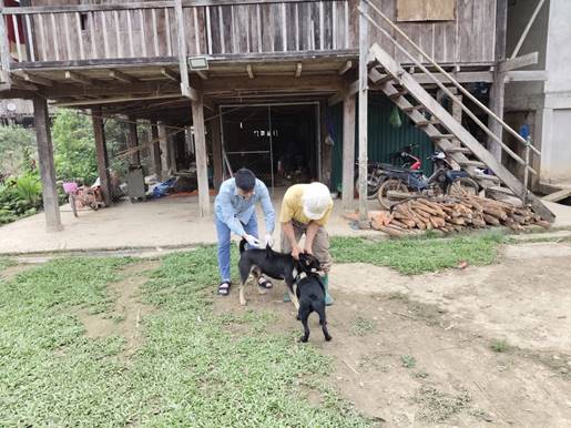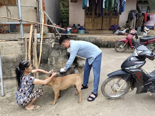 Cán bộ thú y Trung tâm Dịch vụ Công ích xã thực hiện tiêm vắc xin phòng bệnh Dại cho chó tại các hộ dân tại thôn Nà Bắc, xã Đoàn Kết